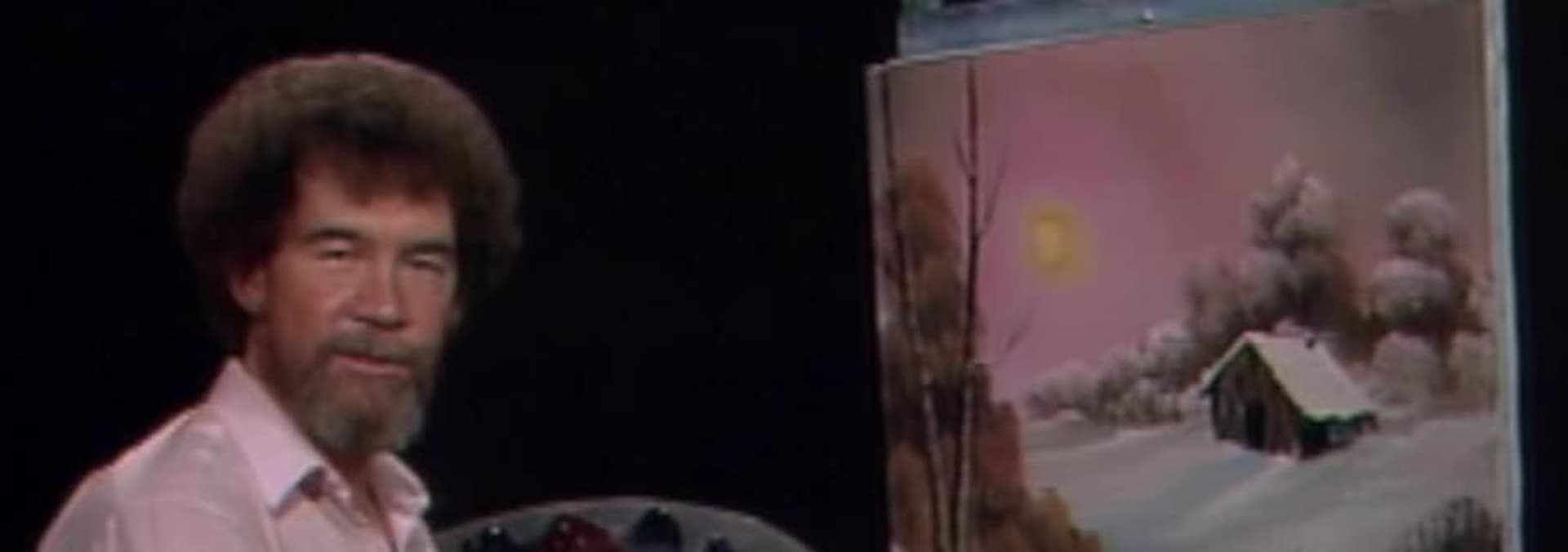 The field of snow and the little cabin yield to the bright, orange sun -- Bob Ross conveys harmony in this cold, but cozy scene.