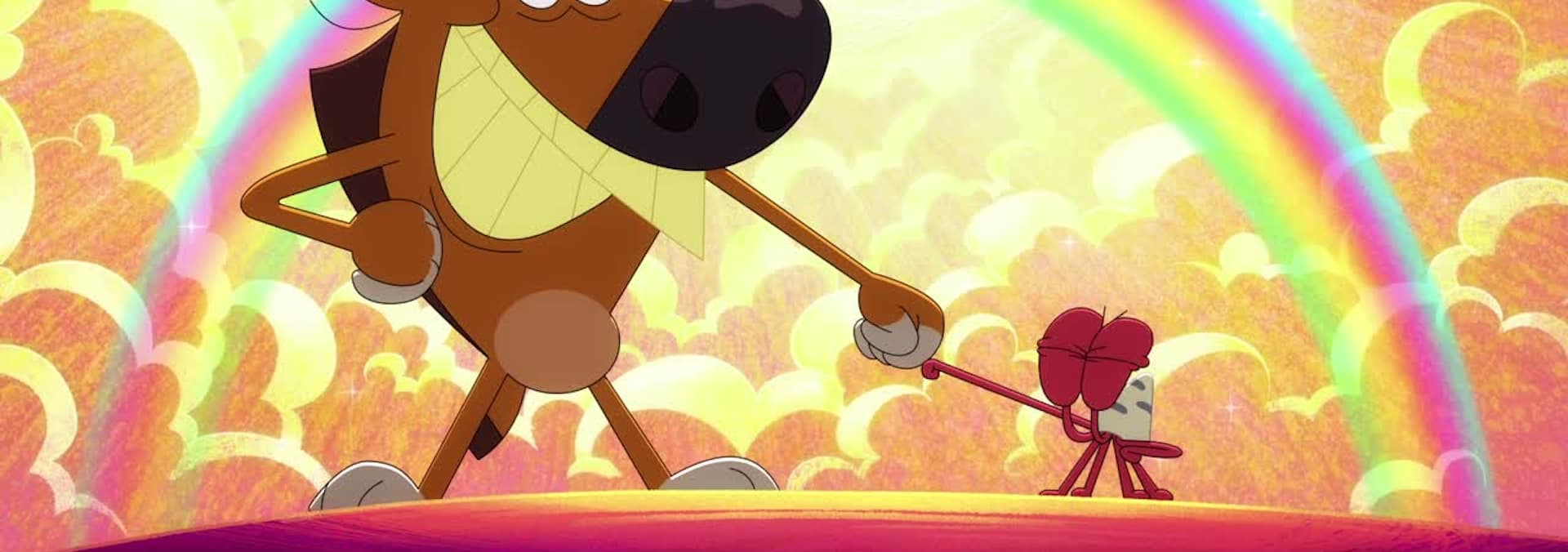 A chase between Zig and Sharko ends with the hyena getting covered in pizza. Haha! Marina takes a picture and posts it on social networks. Unexpectedly, the photo makes Zig the Star of the Beach...LOL ! | Marina wants a dog and then Zig comes along! The hyena doesn't put up a fuss: as long as he can approach the mermaid he doesn't care. Even if it means playing daddy's little doggy with Sharko? | Zig uses a fake moustache to approach Marina. Of course Sharko exposes him, but all the beach people like the stranger with the stache! Sharko comes back to the beach wearing a wig. Now they're even...