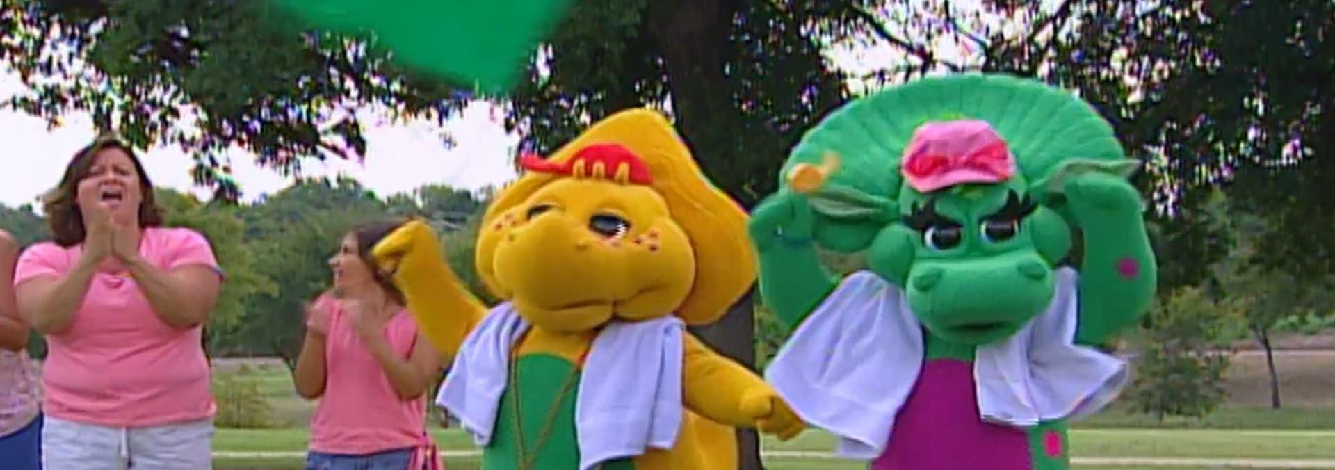 When some of the children in the park invite Barney to join them for a race./When BJ starts to feel sick after eating too many sweets, he lies down in hopes of feeling better.
