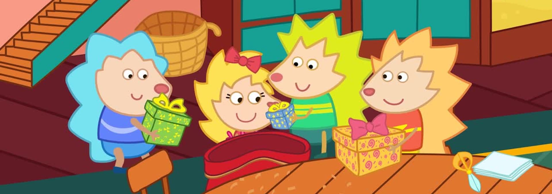 Ben was fishing on the beach. Sid came, turned music on, and started dancing. But he didn't know, that it was mermaid underwater and Sid was bothering her with music. Ben wanted to help mermaid, and turn music off, but Sid wasn't agree., Children were showing different animals, trying to guess who is who. Peggy showed a butterfly and children guessed it very fast. But then they heard rustling, and thought that it is Ben. But Ben came from another side. Who it was in those bushes?, Children were having tea in the abandoned house with the ghost. Ben saw a weird book, and decided to read it. It was a spell book! Ben decided to use it to make all wishes of his friends come true., Children were playing basketball. Thorny played worse than Sid, as he was smaller. Then Thorny decided to make a drink that would make him bigger. When Thorny became bigger, he played better than Sid!, It was competitions in the village of hedgehogs. Ben saw a basket with sweets, and wanted to take it, but Sid stopped him, as that basket was a first prize. The race started, everybody started running, but Ben decided to cheat. What he was up to?, Ben were playing with his plane. Then there was a big gust of wind that brought his plane to the abandoned house. Ben was scared to go there alone, and he decide to ask friends to help him. Thorny took his new invention and friends went looking for the plane., Friends went looking for treasures with a new invention of thorny. This device beeped and Sid started digging, but it was just an old can. But friends didn't give up and kept searching. And soon they found a real hoard., Alien was flying in the city, but suddenly his space ship crushed, and landed on the roof of hospital. He asked Thorny and Ben to help him to pass all the building without being noticed. But it wasn't as easy, as they thought!