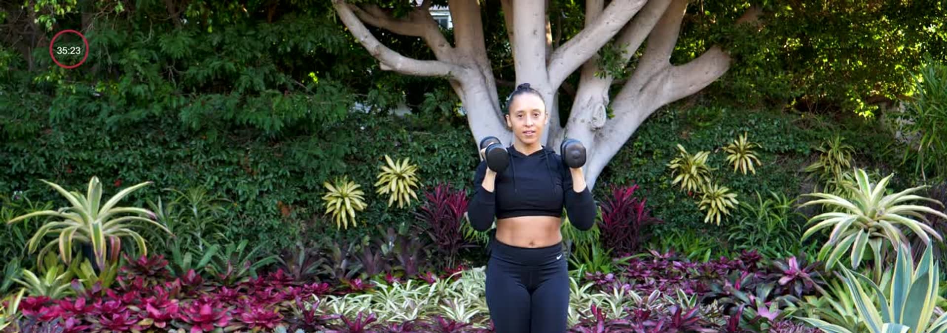 This full body burner can be done anywhere, anytime! Grab a pair of challenging dumbbells and get ready to sculpt your entire body.