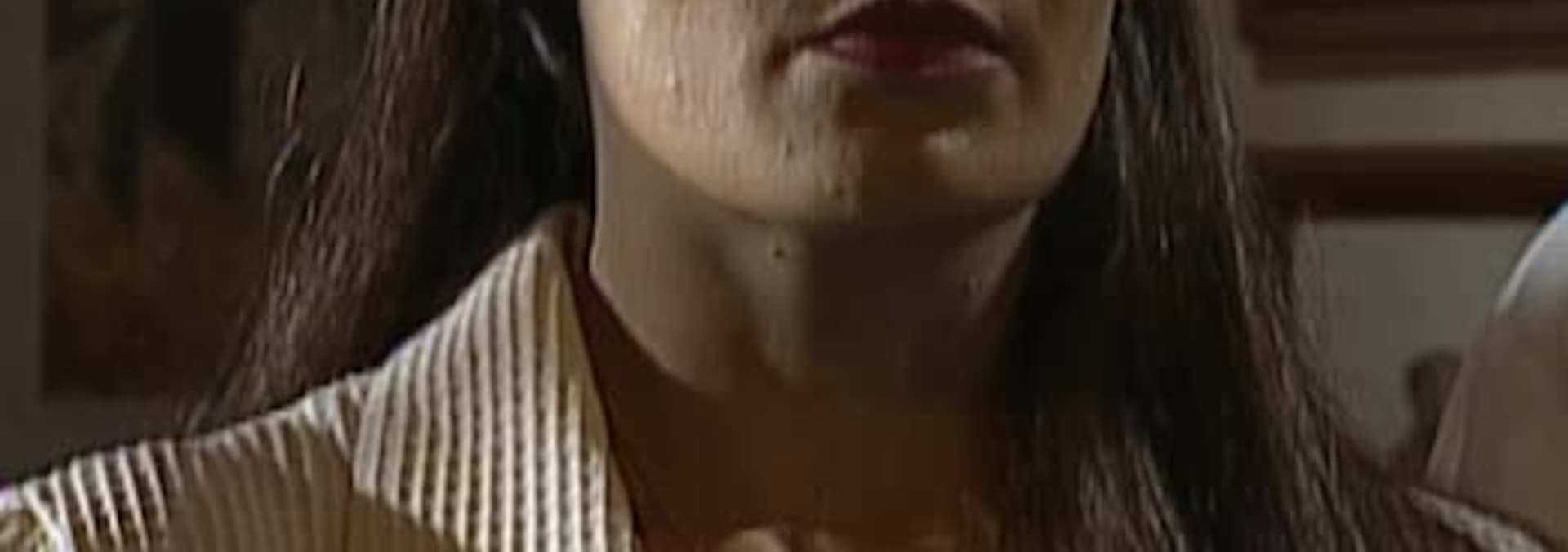 María de los Angeles, en el estudio, contempla un cuadro de Héctor Córdova y observa un anillo en el que está inscrito el escudo que ella lleva en su cadena.