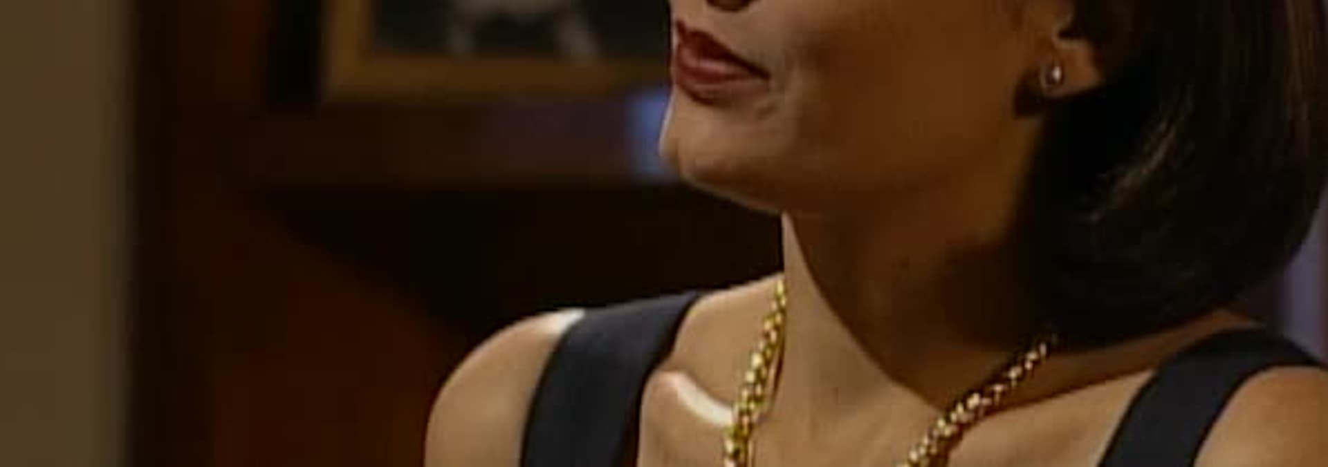 María de los Angeles, en el estudio, contempla un cuadro de Héctor Córdova y observa un anillo en el que está inscrito el escudo que ella lleva en su cadena.