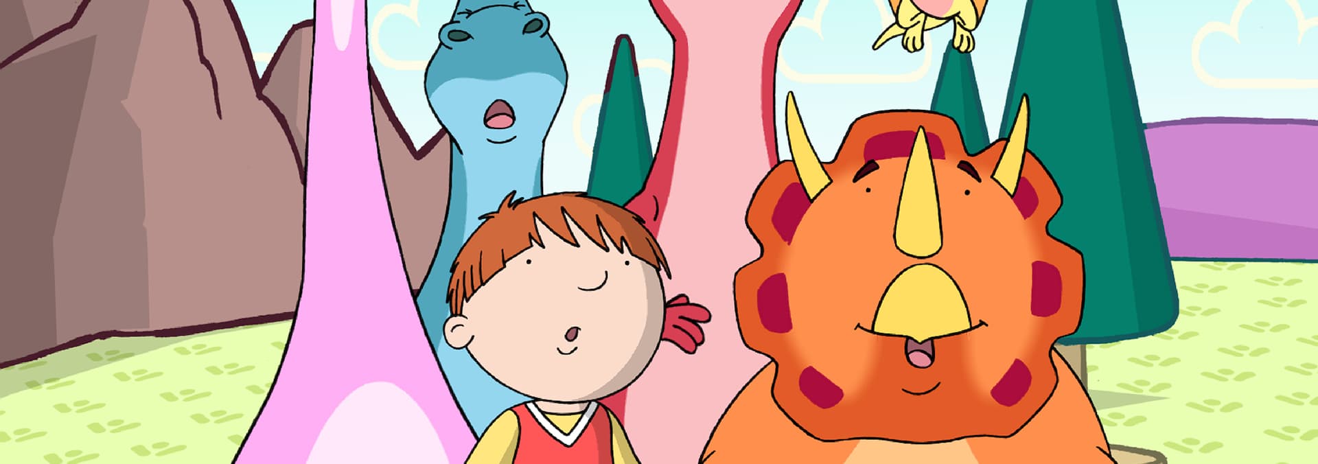 Harry is disappointed to find that he is not able to join in with any of the activities his family are taking part in at home, so he decides to go to Dino-world to invent his own clubs, which only himself and the dinosaurs can join - i.e. Bungee jumping, messy cooking… / When Harry is told to tidy his room he simply transfers all the mess into Dino-world, where he is told there is a 'no tidying up rule'. This results in chaos in Dino-World and Pterence ends up getting lost in all the rubbish causing Harry to tidy Dino-World - and his bedroom.