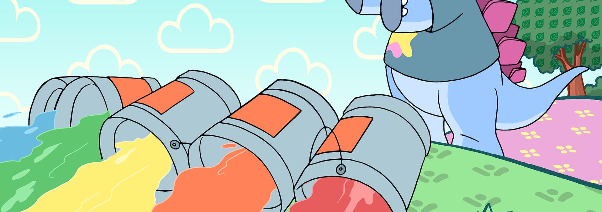 Harry fails to see any benefit in rain when a visit to the beach is rained off. He decides to go to Dino World where it is extremely sunny and hot, and more importantly, he can wear his new sunglasses. However, the discovery of a beached dolphin and subsequent rescue operation soon makes Harry realise just how important rain is. / Harry and Charlie have their football confiscated because they are unable to play football together without arguing. They go to Dino-World to find a replacement football and have another match. Charlie is not very good at Football so Harry becomes vociferously frustrated with her and then sulks off on his own. While Harry is alone reflecting on his behaviour, the dinos help Charlie to improve her football skills. He ends up apologising for being so mean to Charlie and the story ends with the pair reconciled and enjoying a friendly game of football in Harry's garden.