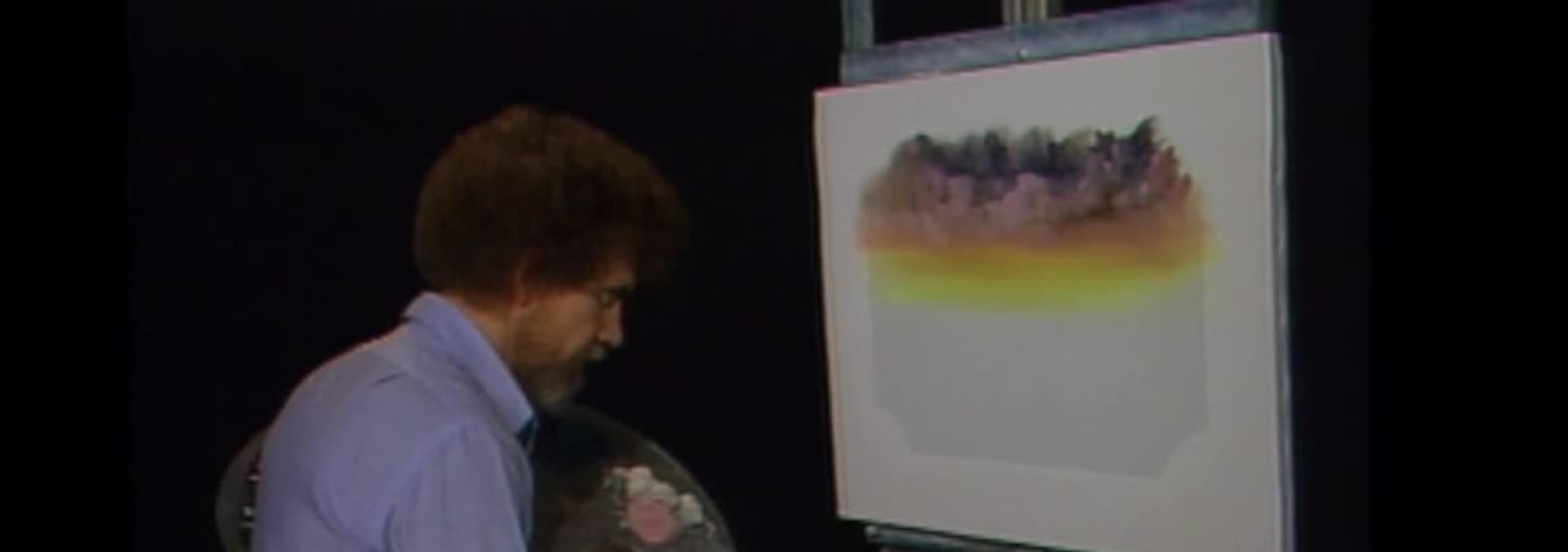 Bob Ross pinta un campo dorado de pinos ralos y otras zonas verdes dentro de la forma única de un rectángulo cónico con esquinas recortadas.