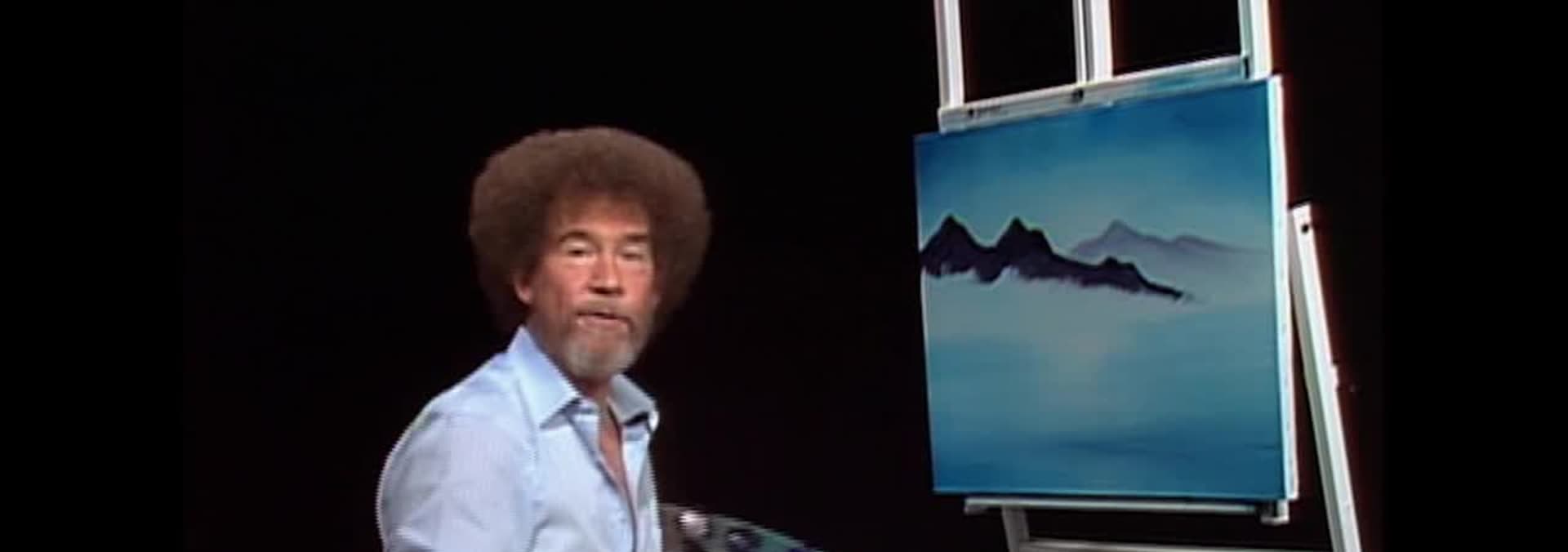 Bob Ross te lleva a un hermoso lago en el campo alto -- vislumbra las magníficas montañas, imágenes que se hacen eco en el agua cristalina de abajo.