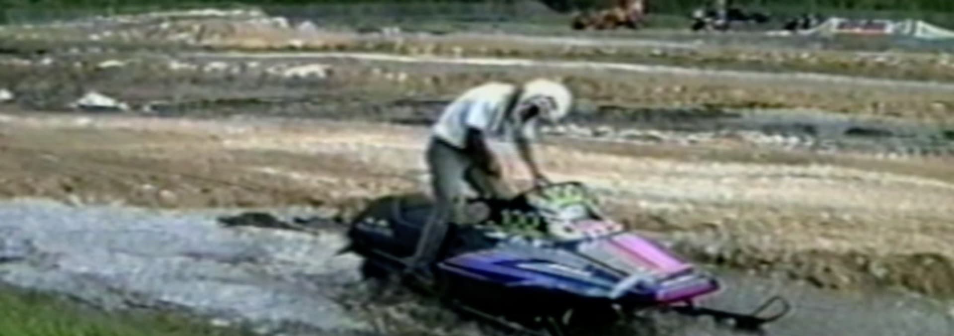 Dog plays fetch in leaves; dog doesn't want to get out of wheel barrow; ski-doo accident.