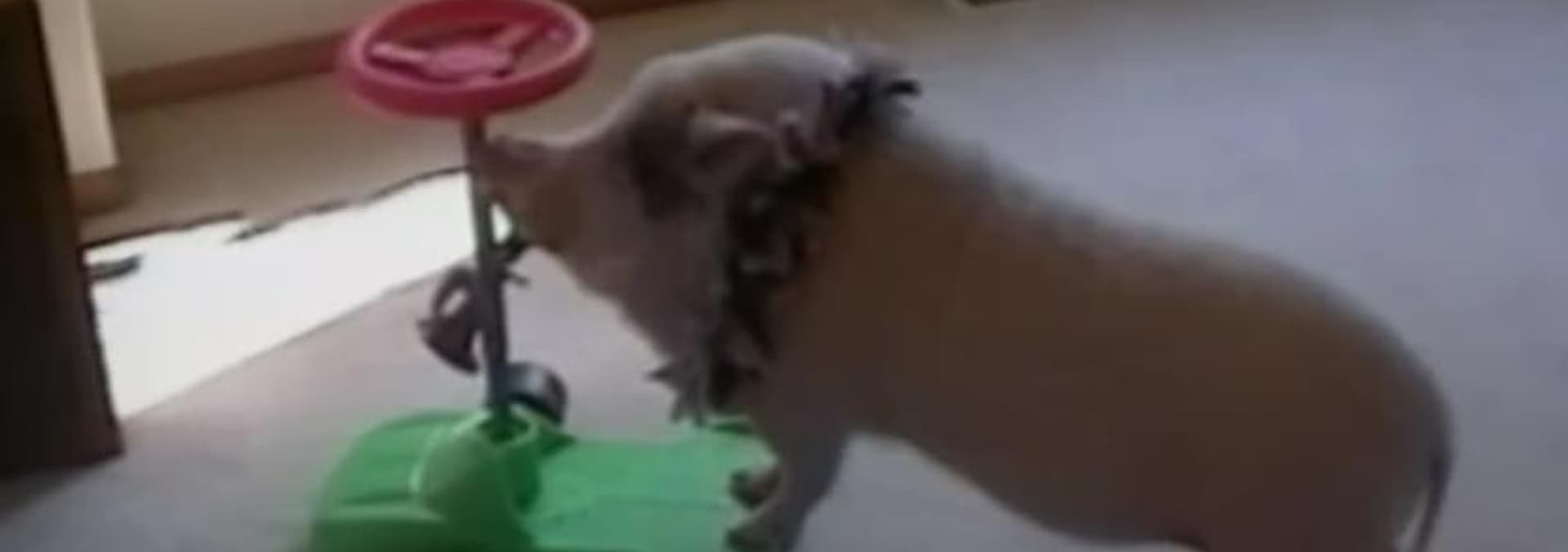 Cats heads bob around and around; black cat slips and slides; dog scratches its butt on the floor.