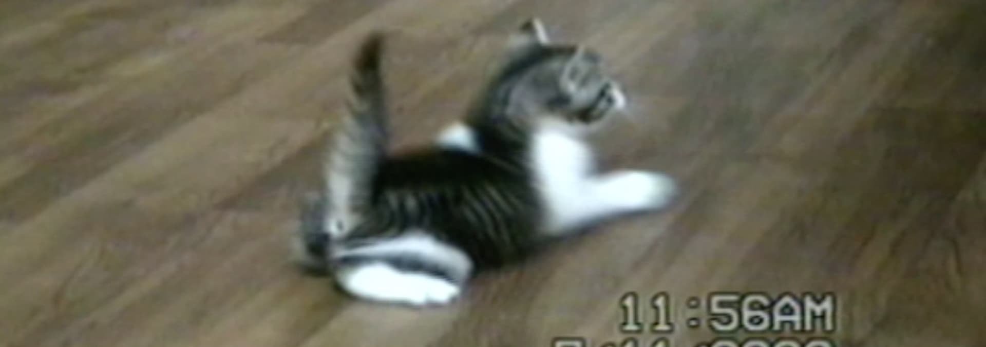 Dog twirls with rope in mouth; field mouse running circles; parakeet goes in circles on food dish.
