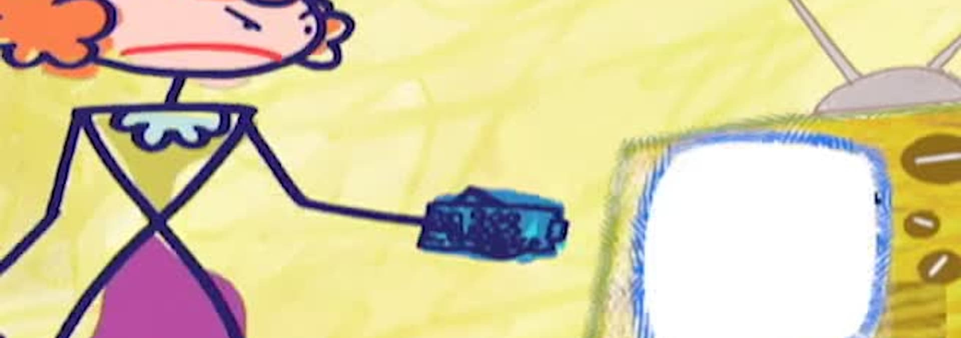 La imaginacion de Stacy y Bradley provoca que el almuerzo de Russell cobre vida. / Stacy cambia el control remoto de la tv.