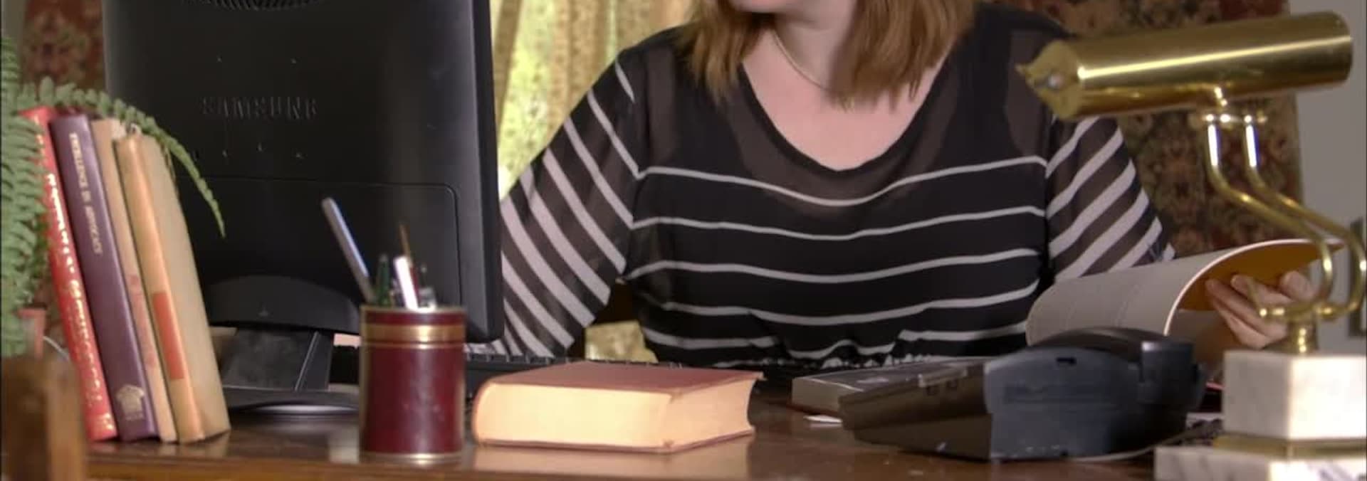 Don Wildman examines a ragged tome, a Renoir painting, and a police ledger.