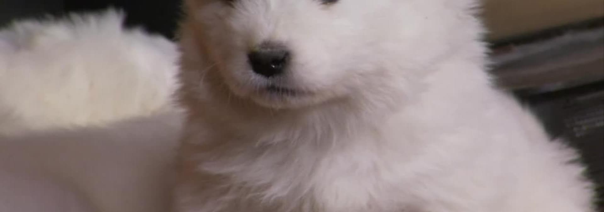 A terrier puppy befriends the cat, and Samoyed pups follow the rules.