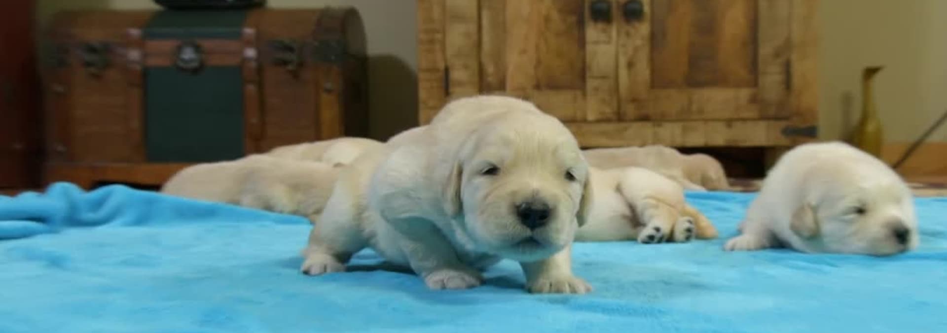 Golden retriever pups get active while Great Danes find their legs.